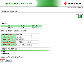 公共料金自動引落登録(実行)画面が表示されます。
