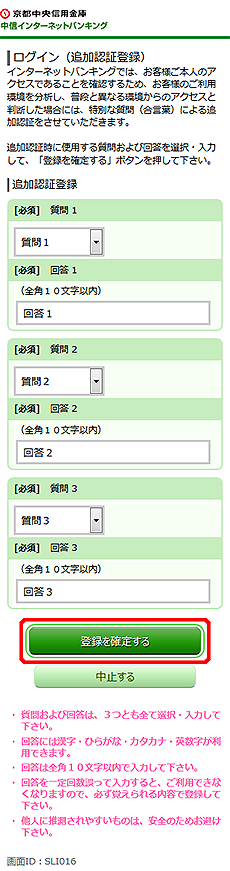 質問を選択のうえ、回答を入力し、[登録を確定する]ボタンをタップしてください。