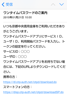 メール本文に記載されているサービスIDとユーザIDをお控えのうえ、スマートフォン用アプリのダウンロード先URLのリンクをタップし、Webページの指示に従ってワンタイムパスワードアプリをダウンロードしてください。本アプリのダウンロード用URLには、iPhone端末にプリインストールされているブラウザからアクセスしてください。