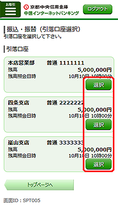 ご利用可能な引落口座の一覧が表示されますので、引落口座に指定する口座の[選択]ボタンをタップしてください。
