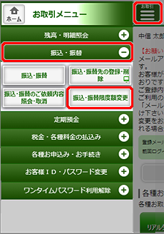 [お取引]ボタンをタップし、お取引メニューの[振込・振替]をタップのうえ、[振込・振替限度額変更]ボタンをタップしてください。