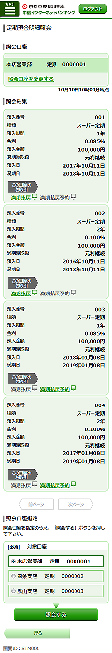[払戻]ボタンをタップすると、定期預金の払戻を行うことができます。