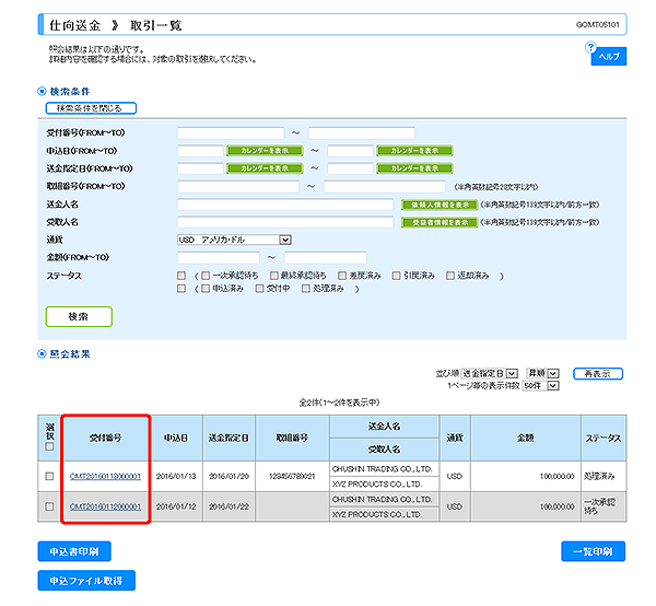 操作者ご自身が作成した取引、または操作者ご自身が承認者に指定された取引を照会することができます。