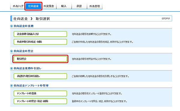 「取引選択」画面が表示されますので、[取引照会]ボタンをクリックしてください。