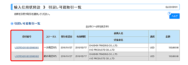 引戻しする取引の『受付番号』をクリックしてください。