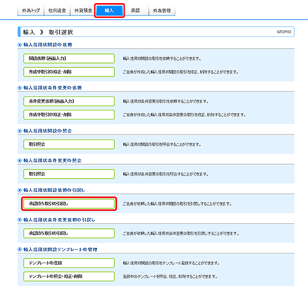 「取引選択」画面が表示されますので、輸入信用状開設の引戻しの[承認待ち取引の引戻し]ボタンをクリックしてください。